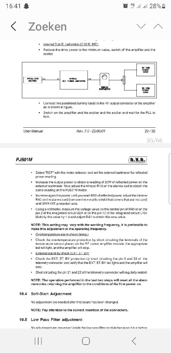 | Hallo, Wat betekent bij een RVR PJ500 het alarm: "int. Swr" internal swr? De swr tussen de sturing en eindtrap is goed 1:1.1. Antenne swr uiteraard ook (dummyload). Enigste wat ik erover kan vinden is de bijgevoegde foto. Wat houdt deze storing in en wat kan dat zijn? Alvast bedankt |