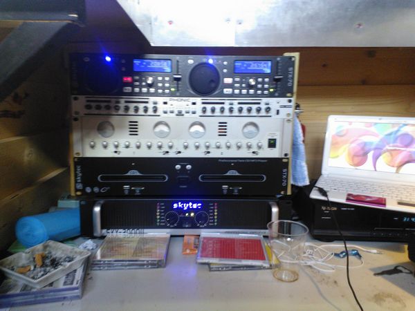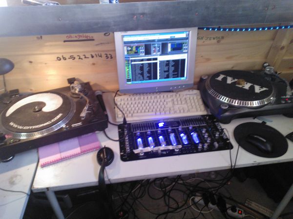 Apparatuur wat gebruikt werd was een mengpaneel van skytec, 2 dubbele cd speler van skytec, 2 draaitafels en een computer voor s’nachts, voor de rest werd alles van single en cd’s gedraaid.